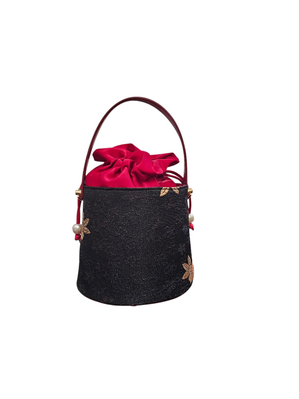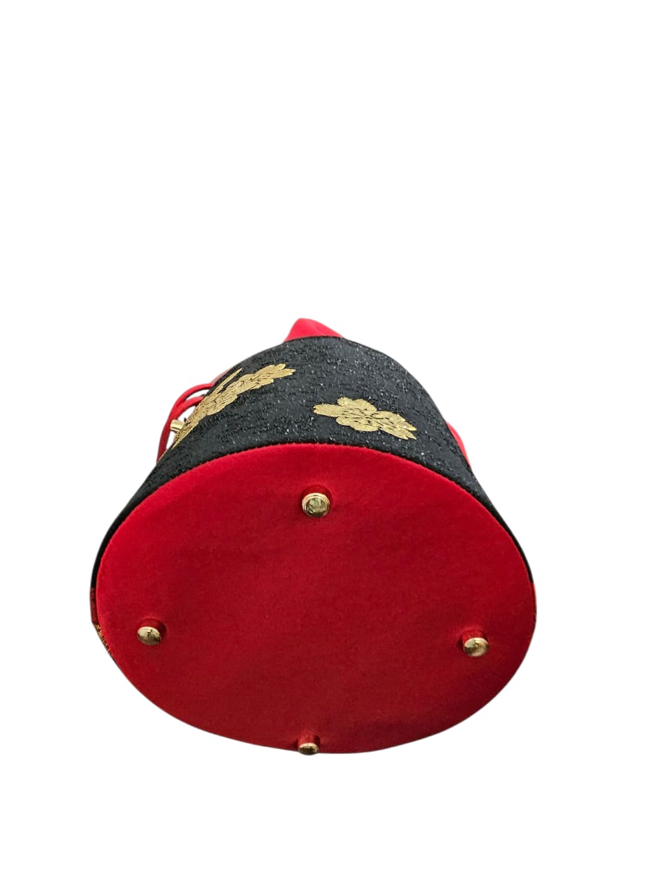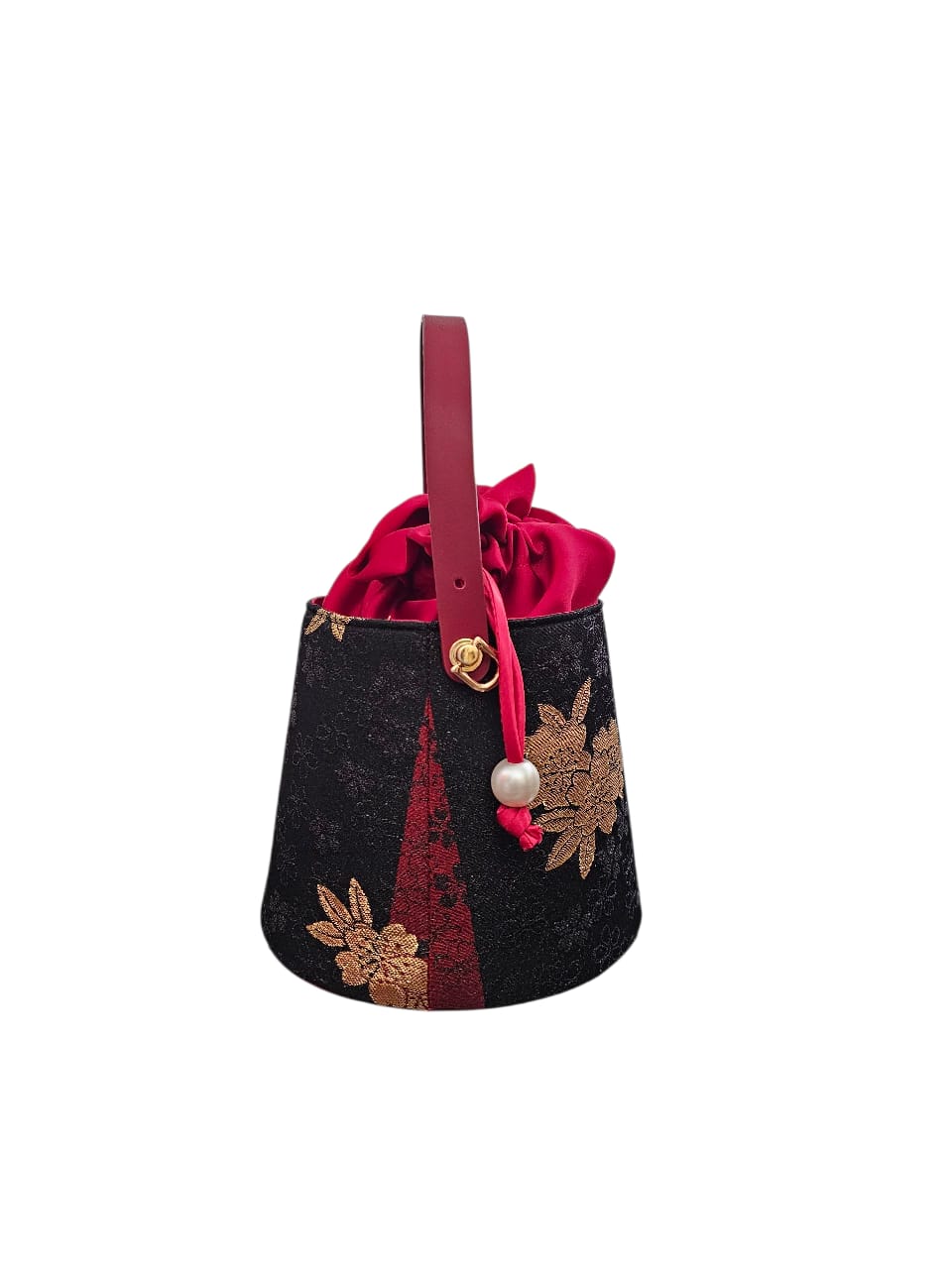 Colour and motifs – Black base with gold flowers. Motifs on this fabric features beautiful Sakura (cherry blossoms) with its distinctive notched petals (almost like a heart shape), blooms briefly and is fragile. It symbolizes new beginnings, renewal, beauty and transience of life. This is a special round bucket design with leather handle.